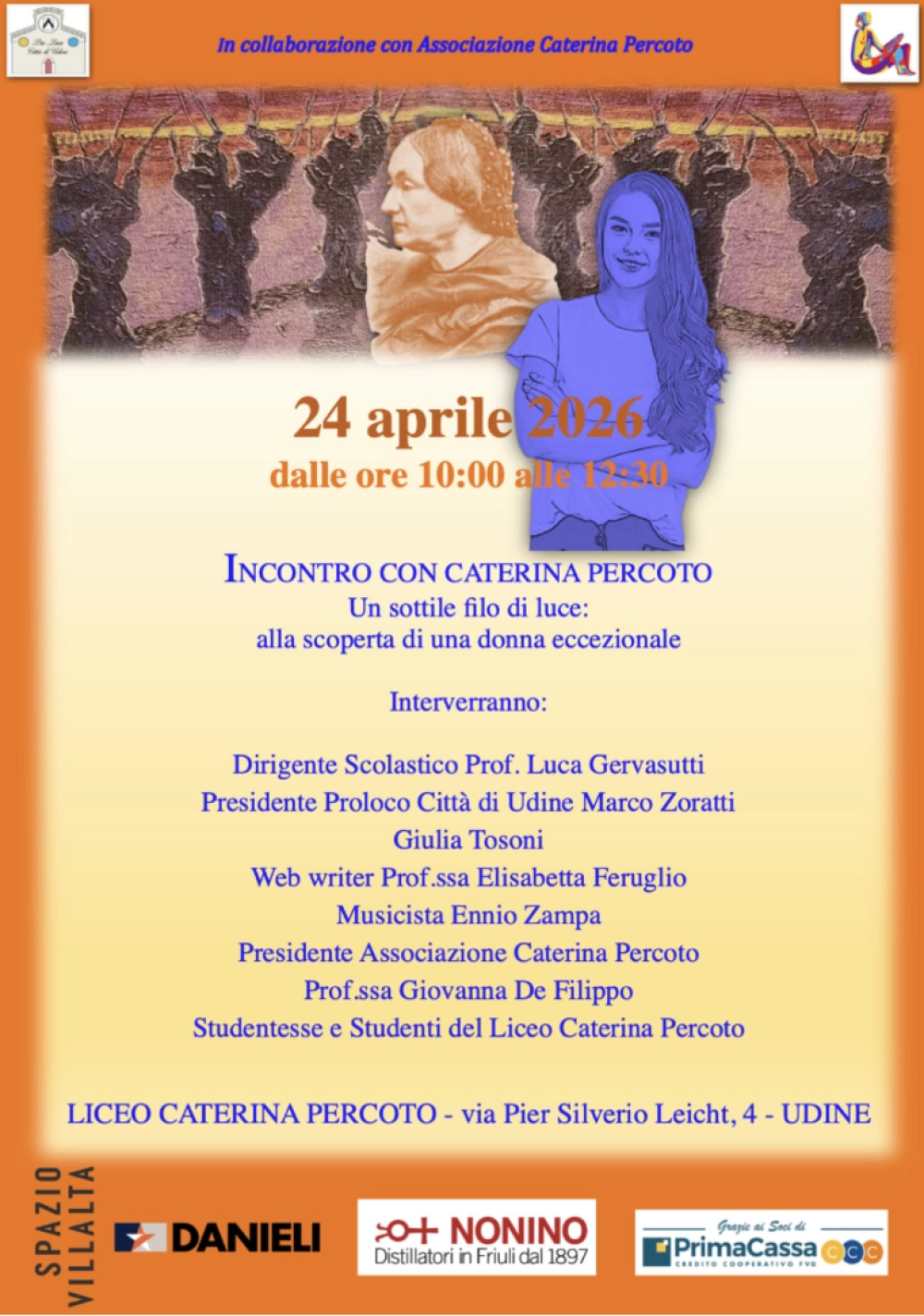Alla scoperta della scrittrice friulana, donna eccezionale, colta, impegnata e attenta osservatrice della società, precettrice interessata all'educazione e formazione delle giovani generazioni: si parla di Caterina Percoto presso il Liceo 'Percoto' il giorno 24 aprile 2026 dalle ore 10:00.
